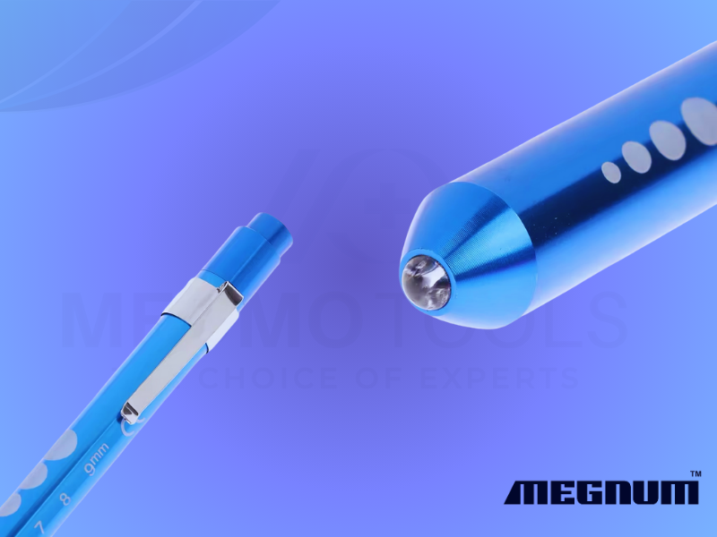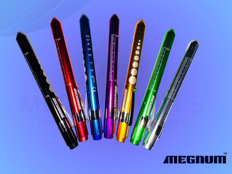 LED Medical Penlight with push top on and off switch, metal pocket clip, easy to use and carry.