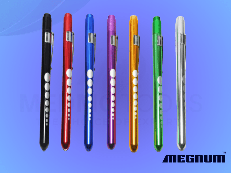 LED Medical Penlight with push top on and off switch, metal pocket clip, easy to use and carry.
